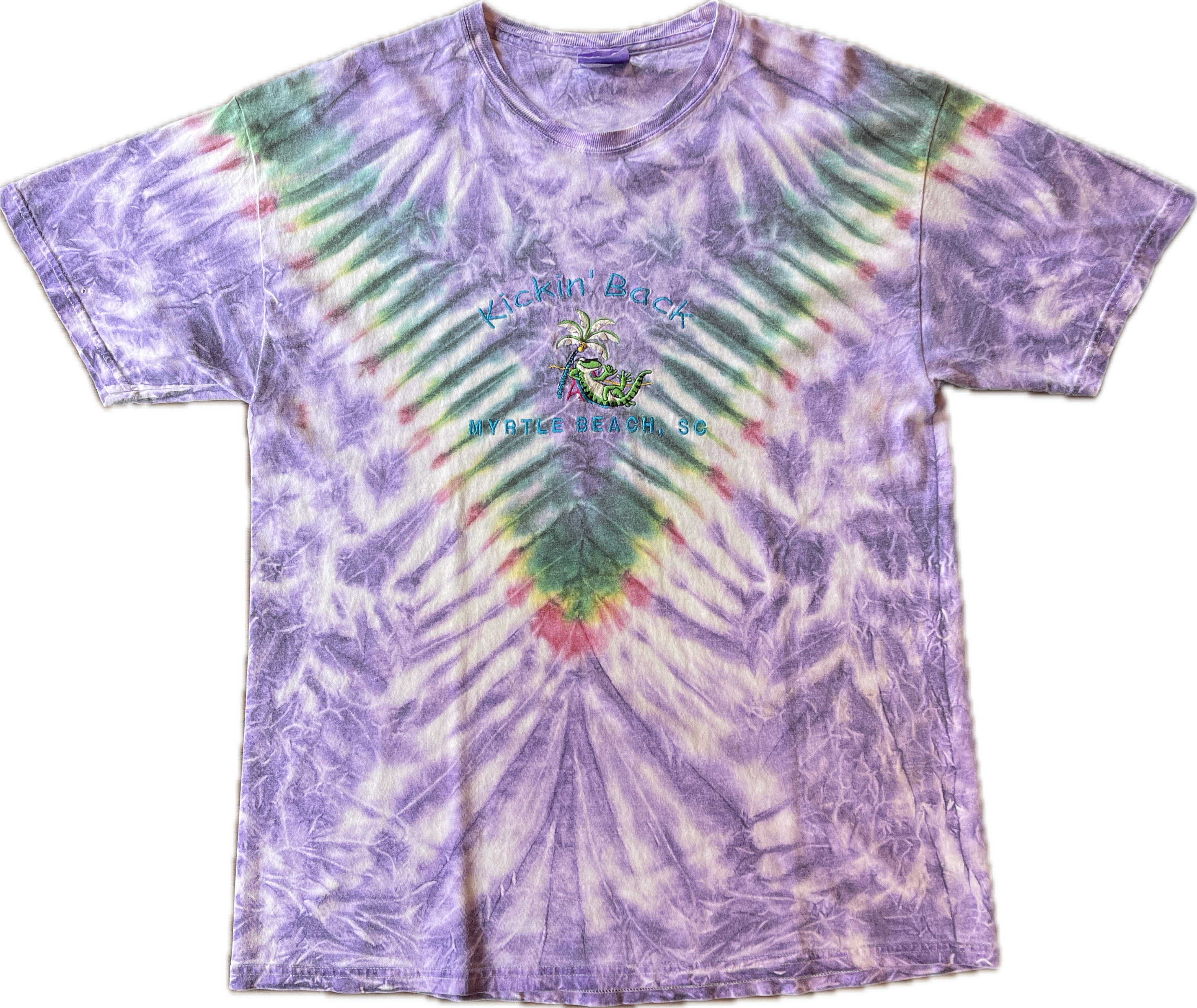 このTシャツは、アメリカ・サウスカロライナ州マートルビーチのスーベニアアイテムとして特別な存在感を放つ一枚です。タイダイ染めのユニークなデザインには、印象的なトカゲが描かれており、個性的なスタイルを楽しむことができます!